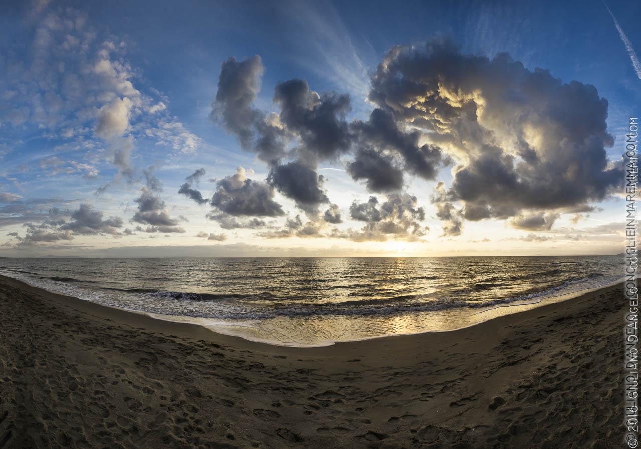 In questa vista molto grandangolare quasi a 180°, qualche mese fa ho catturato il tramonto più bello del 2015. Questo è quello che ho pensato quando ero con la camera sulla spiaggia di Fiumara. Uno di quei molti casi in cui la foto non la fa il fotografo, il quale ha solo il merito di essere li in quel momento. Succede ogni anno di decidere quale sia stata la giornata fotografica ideale: quella con i contrasti perfetti, la luce diffusa e rifrangente, la visibilità infinita all’orizzonte; quando ti sembra di percepire la rotondità del pianeta e le onde increspate che tagliano il cielo.