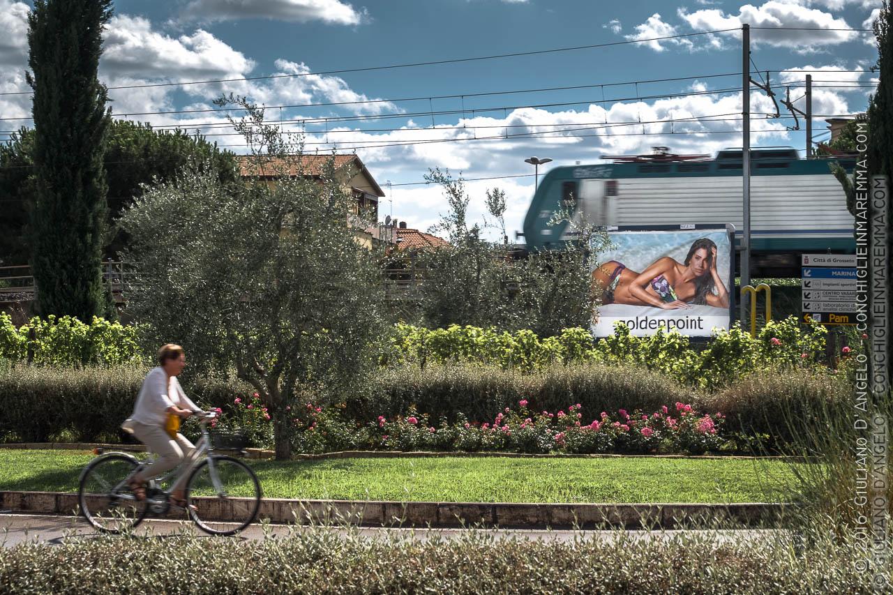 Questa è solo una rotonda, quella di Piazza La Marmora, che riproduce una vigna in miniatura ed un oliveto in un fazzoletto di città immersa nel traffico. Trovo divertente la campagna pubblicitaria brillante e sofisticata che spunta tra la segnaletica, i ciclisti in rotatoria e i treni che sfrecciano costeggiando la via Aurelia.Riflessione: ancora una volta riscontro qualche difficoltà nel fotografare la normalità di un insignificante angolo della città . Finchà© fotografi monumenti, prati in fiore e balconcini, tutto fila liscio; ma se fotografi la normalità troverete che il meccanismo si inceppa e scatta la diffidenza. Devi farti riconoscere dalle persone e spiegare perche lo stai facendo: e mica è facile!
