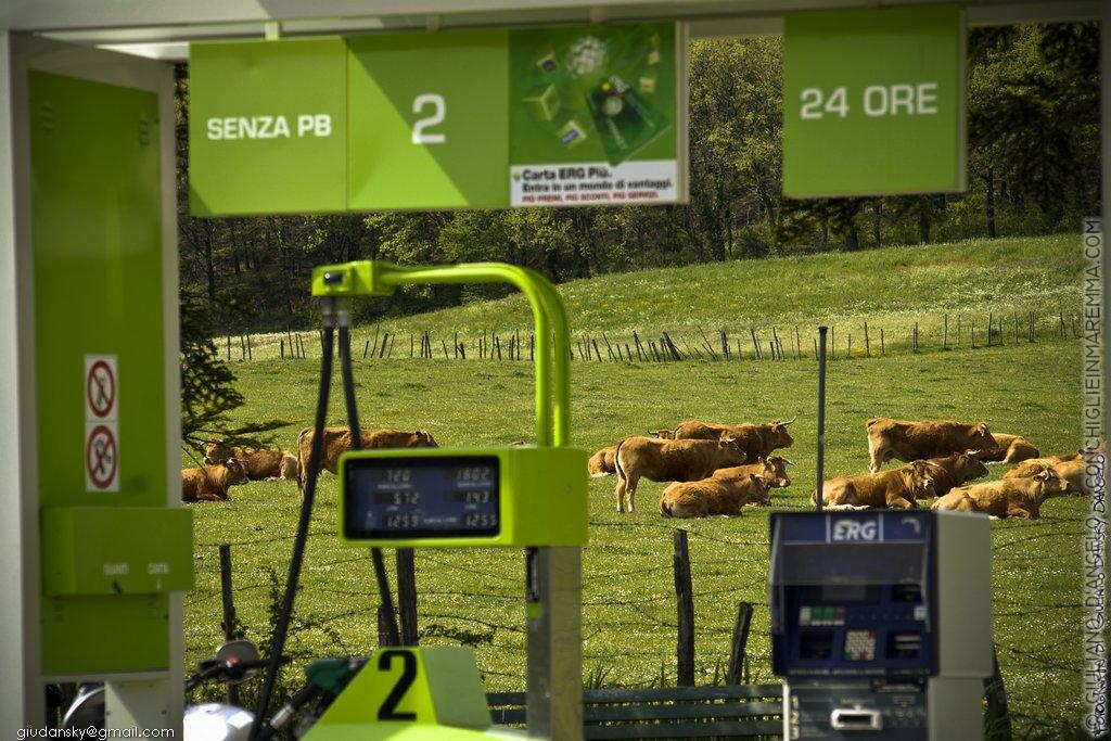 In questo caso mi è parso particolarmente ironico utilizzare la quinta di un distributore per incorniciare un paesaggio di pura campagna come questo. Contrasto di un tipico elemento metropolitano con il prato e le mucche.