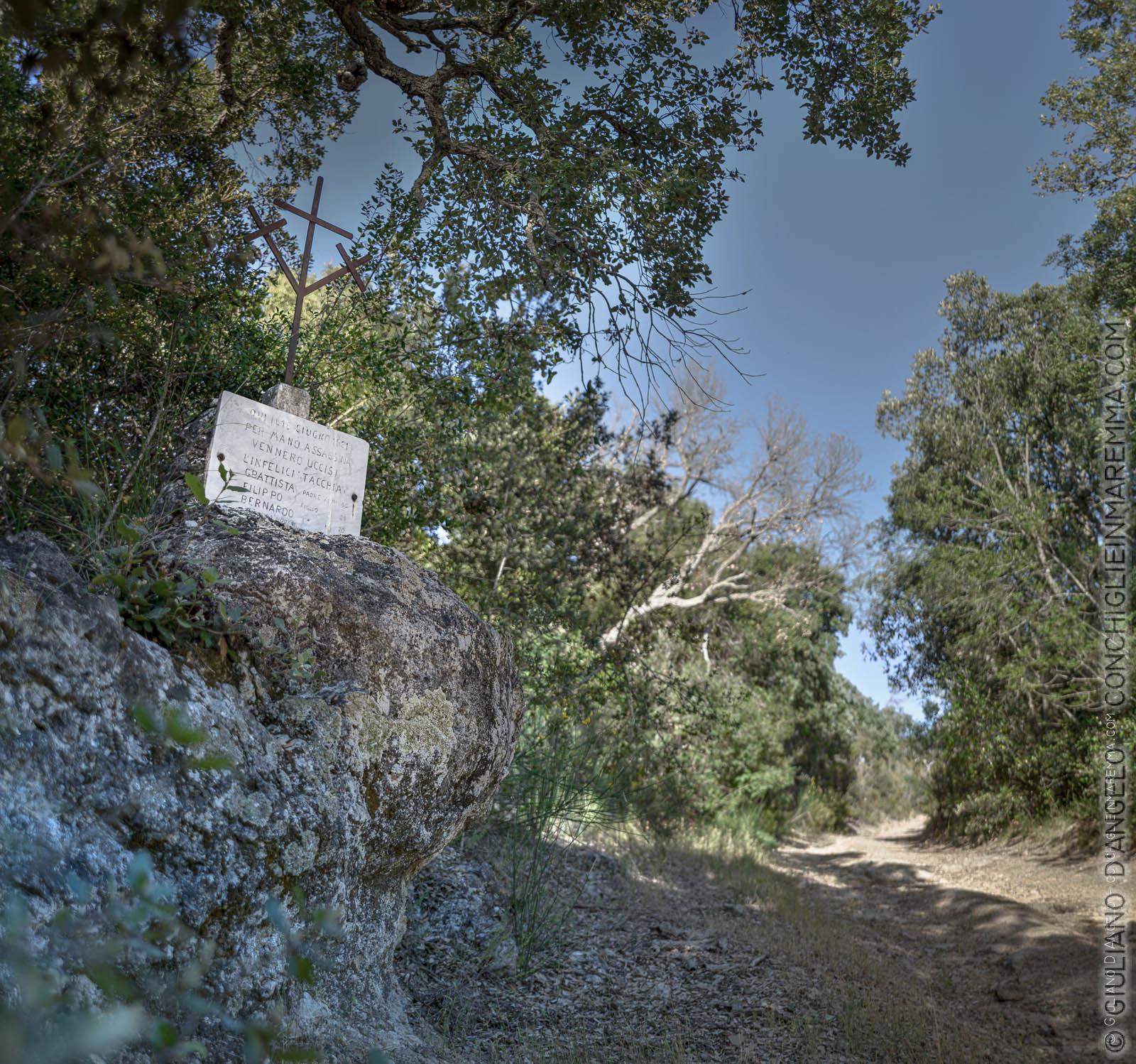 Al bivio con una apertura tagliafuoco del bosco ho girato a destra. Percorso un breve tratto esposto al panorama: Roselle, Grosseto e i Monti dell’Uccellina all’altra estremità della piana maremmana. Sotto una sughera malformata di tumori, sopra uno scoglio di roccia ecco il cippo con la croce a tre punte.
