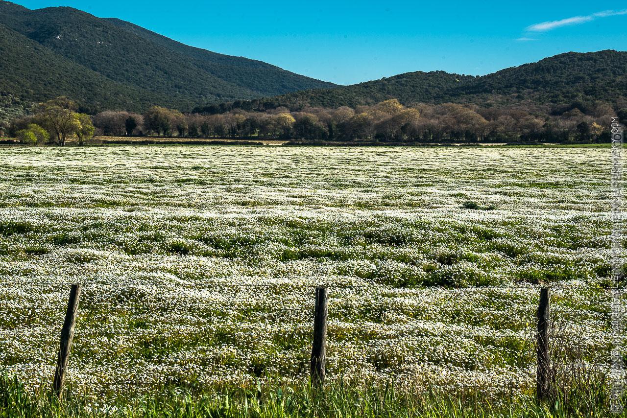 Un mare di miliardi di margherite non lascia dubbi alla stagione, sulla strada del Mare di Spergolaia, Alberese. Difficile tenere ferma la macchina starnutendo, fortuna che la luce bianca abbaglia l’esposimetro e potrei scattare senza mosso col diaframma serrato precipitando in volo dai monti dell’Uccellina.