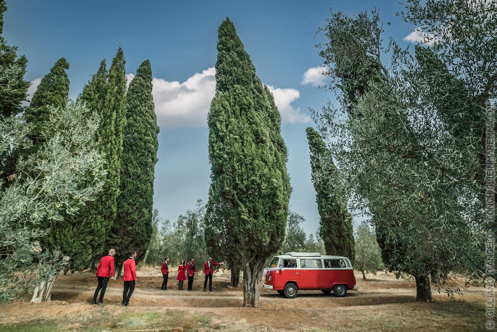 Delle giacche rosse in mezzo ad un oliveto e un viale di cipressi secolari sono sicuramente fotogeniche. A maggior ragione se dal viale sopraggiunge “fortuitamente” un Volkswagen westfalia dello stesso colore: passaggio assicurato.