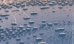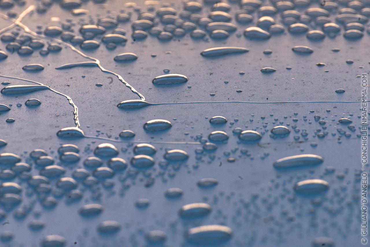 Per una rara coincidenza è successo che le traballanti cavallette appoggiate nel prato, sul terreno sconnesso, fossero in realtà in un equilibrio incredibilmente perfetto. Sui pannelli che avevo lasciato ad asciugare, la pioggia ha lasciato così enormi grandi goccioloni. Un micro mondo in un vibrante, delicato, perfetto equilibrio. Una geografia di isole cristalline, dense, circolari e perfettamente distribuite, come quelle di un arcipelago visto in volo. La tenda immersa nel sole ha creato sopra di esse un riflesso come quello del metallo fuso.
