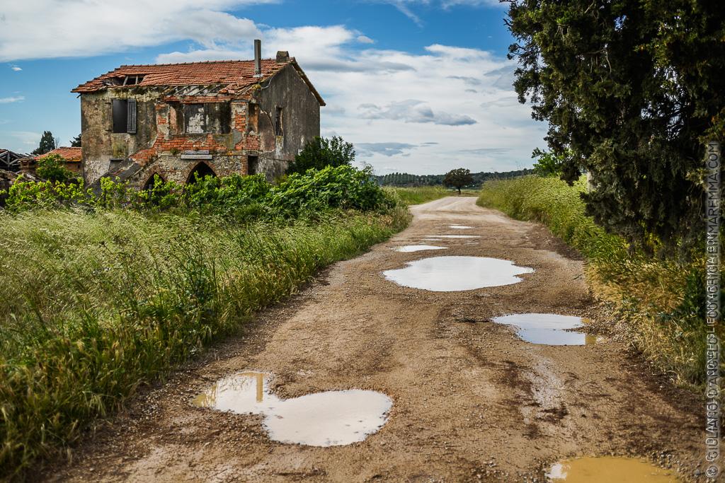 Era da tempo che desideravo fermarmi lungo il percorso che mi porta a Roma, per ritrarre un poderetto solo e affascinante nella vecchia campagna al confine sud della Toscana. Una modesta abitazione rurale con degli archi a sesto acuto degni di una grande fortezza senese. Mi sono fermato per scattare un ritratto ad uno degli avamposti della vecchia Aurelia che non esiste più.Sono tre antichi piccoli borghi divisi dalla velocità dell’asfalto, feriti dalle frenate dei pneumatici dei tir e dimenticati dai viaggiatori che da Roma vanno a Capalbio o più su verso Grosseto. Abitazioni, chiese e poderi che una volta vedevano i calessi fermarsi alle taverne, per abbeverare i cavalli o caricare i prodotti del posto. Quasi dei villaggi, non avrebbero mai immaginato che quel percorso sterrato della antica via Aurelia li avrebbe un giorno inghiottiti. I portoni occlusi dalle lamiere del guard rail, le strisce continue della segnaletica orizzontale sfiorano le soglie delle vecchie taverne e dei depositi.