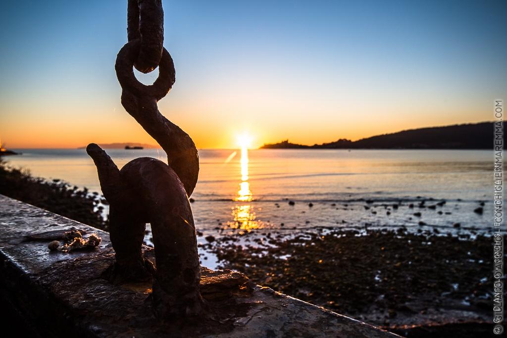 Anni di sale sole e tramonti bellissimi ha visto questa chiusa di ferro sul golfo di Talamone in località Fonteblanda. Al di là della scogliera c’è la bellissima baia del Bengodi, un paese che credevo esistesse solo nelle novelle del Boccaccio e nei rimproveri degli insegnanti. Le squame di ruggine gelida graffiano le nocche reggendo la macchina fotografica. Un altro mostro di ferro naviga al largo dentro gli anelli. L’appoggio è instabile e la paratia urtando il molo risuona come se stessi in bilico su una campana dell’oriente.