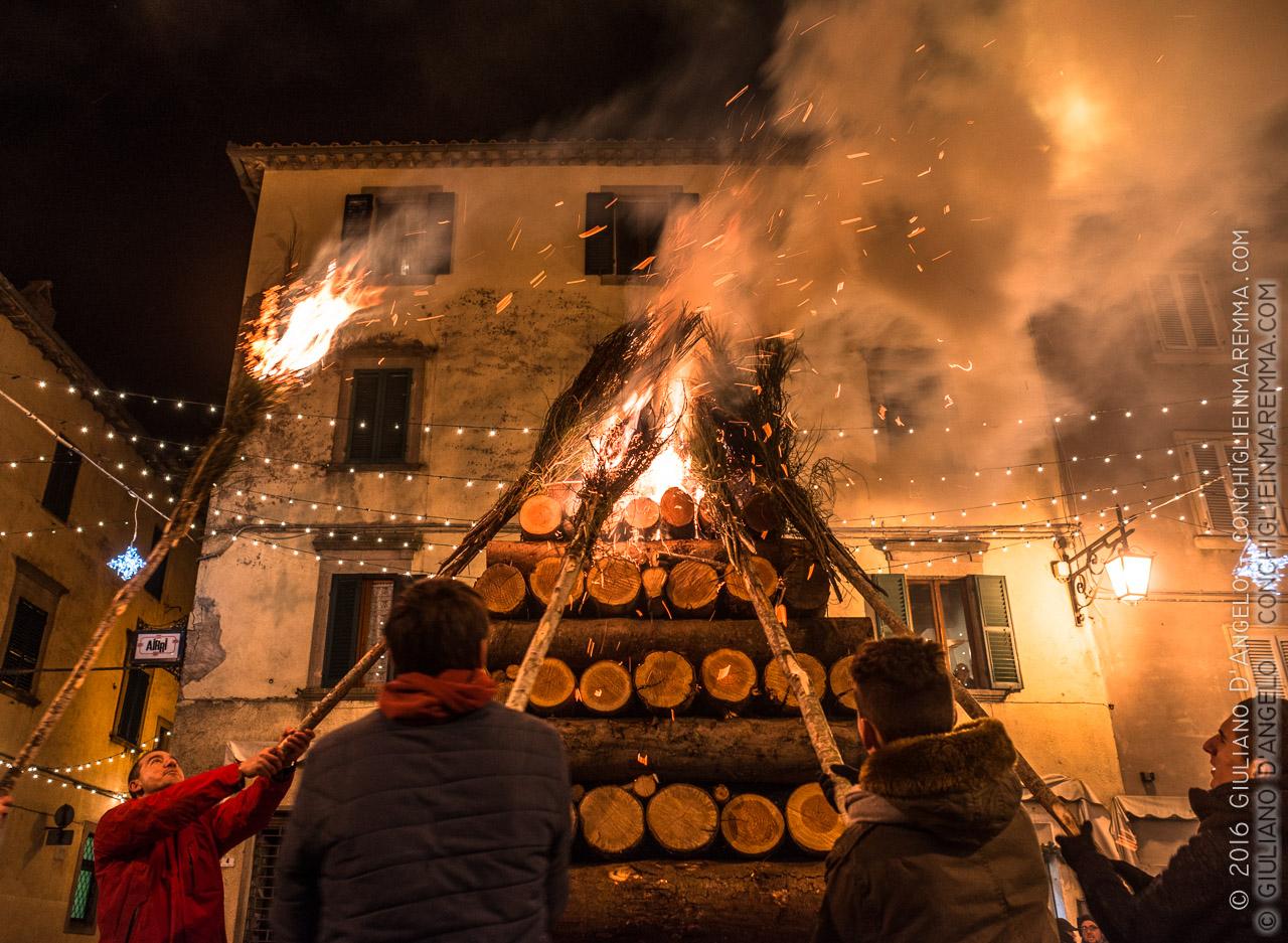 Il momento dell’accensione delle fiaccole, il 30 dicembre a Santa Fiora, sul Monte Amiata. Il vento forte spazza il ponte che porta alla piazza centrale e il fumo delle cataste avvolge tutto il paese, soprattutto nelle prime ore della sera.