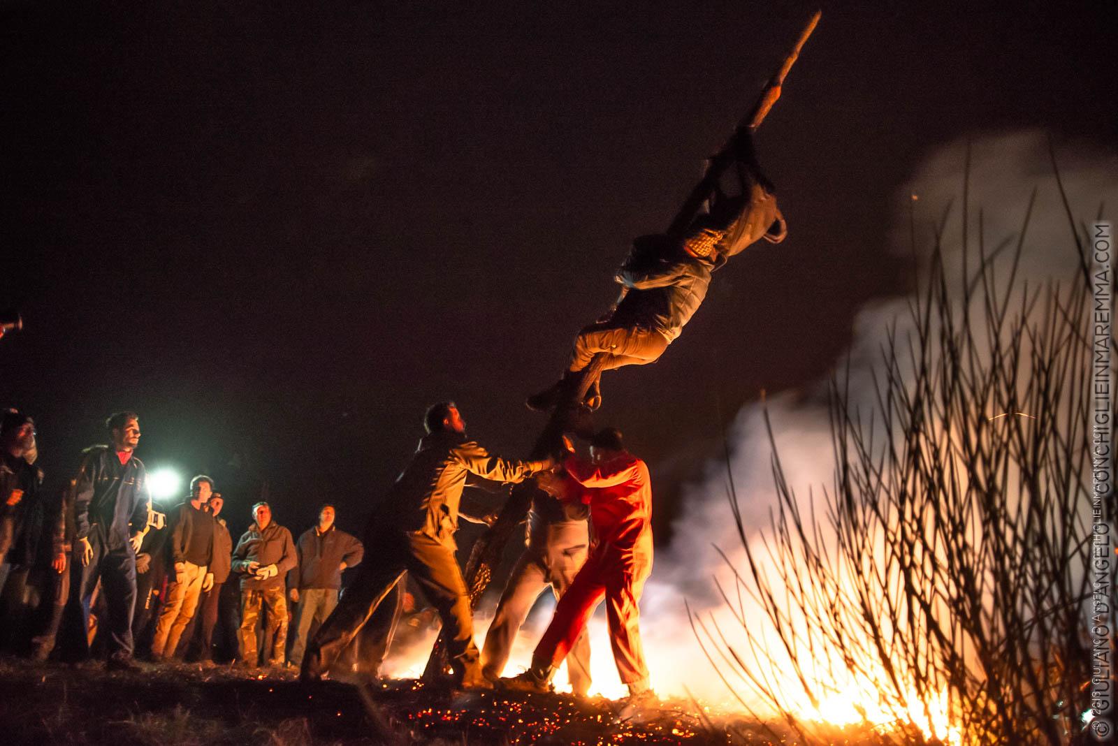 Un evento difficile da fotografare, nel buio pesto della campagna tra azioni rocambolesche. Vietata la luce, niente appoggi, tra spintoni nel fango e sterpi; e piogge di braci scagliate dai calci nel fuoco. L’evento si svolge sempre lo stesso giorno dell’anno, in qualunque condizione meteorologica.