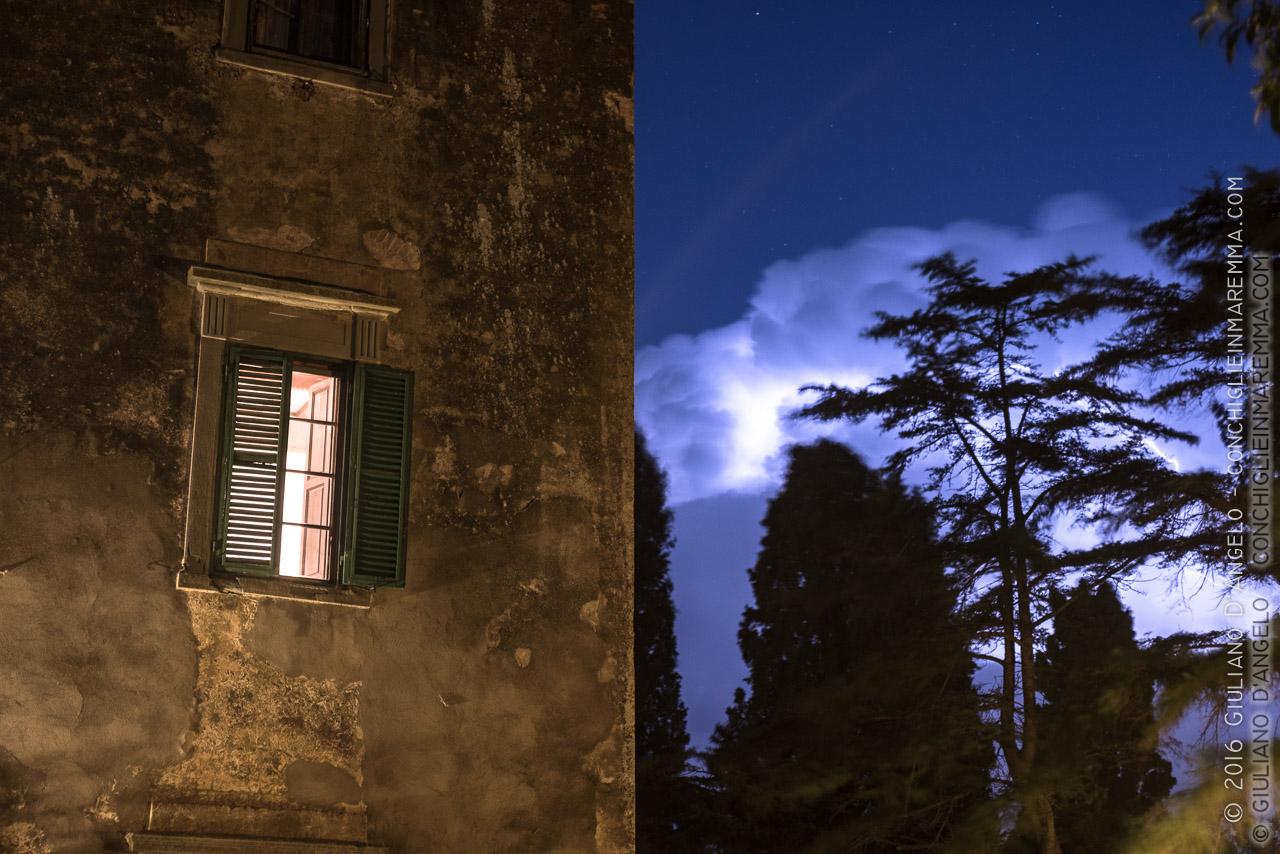 Questo temporale toscano e la luce elettrica di un lampione dividono il fotogramma nella temperatura e nello spazio. Raccontanto il bollente e protettivo calore domestico di un casale e la gelida saetta in una notte di primo inverno.