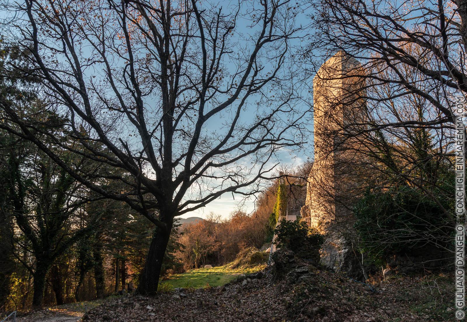 Qui dove sono giunto, c’era una pieve. Ora il bosco arriva a infrangersi fin sotto ai muraglioni rivelando, quasi d’improvviso dietro le fronde, la gigantesca torre pentagonale, accesa dal sole. Mura imponenti che convergono su una gigantesca prua di pietra, dal lato più accessibile del monte dove si trovava l’accesso.