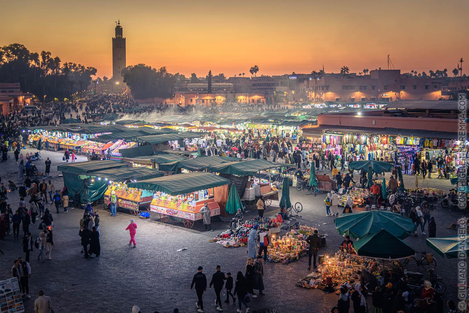 Se si esclude le Koutoubia, l’enorme minareto sul lato est, la piazza è un enorme confuso perimetro di ristoranti, locali da tè e negozi. Di notte, in lontananza, le grandi terrazze dove si sorseggia il tè marocchino posso somigliare a delle grandi navi ormeggiate ad una banchina del porto.