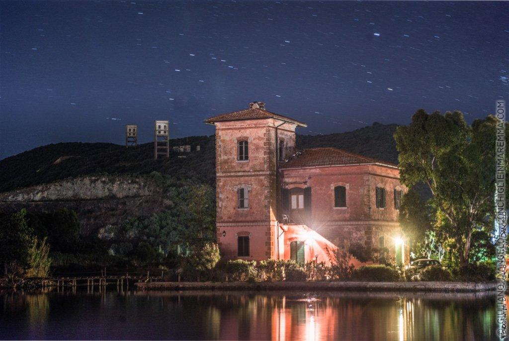 Sorvegliato da un branco di cammelli sonnecchianti del vicino circo, sul bordo della laguna di Orbetello, ho realizzato questo scatto notturno. E’ un vecchio casello idraulico, un’ architettura di valore storico con decorazioni in stile eclettico; nello stile liberty che fiorì in anticipo qui in Maremma grazie ai contributi dell’architetto Lorenzo Porciatti. A Grosseto suo è il villino Pastorelli, la villa di P.zza della Vasca e il palazzo della provincia. Dietro, sul monte Argentario, le due torri in cemento armato che conducevano ai pozzi e che raccontano il passato minerario di questo luogo, da sempre ricco di ferro. La casa fu spettatrice dell’esplosione controllata che nel 1958, su quel crinale scosceso chiuse per sempre l’accesso alle miniere; significava preservare la ricchezza naturalistica della laguna e puntare su un futuro turistico.