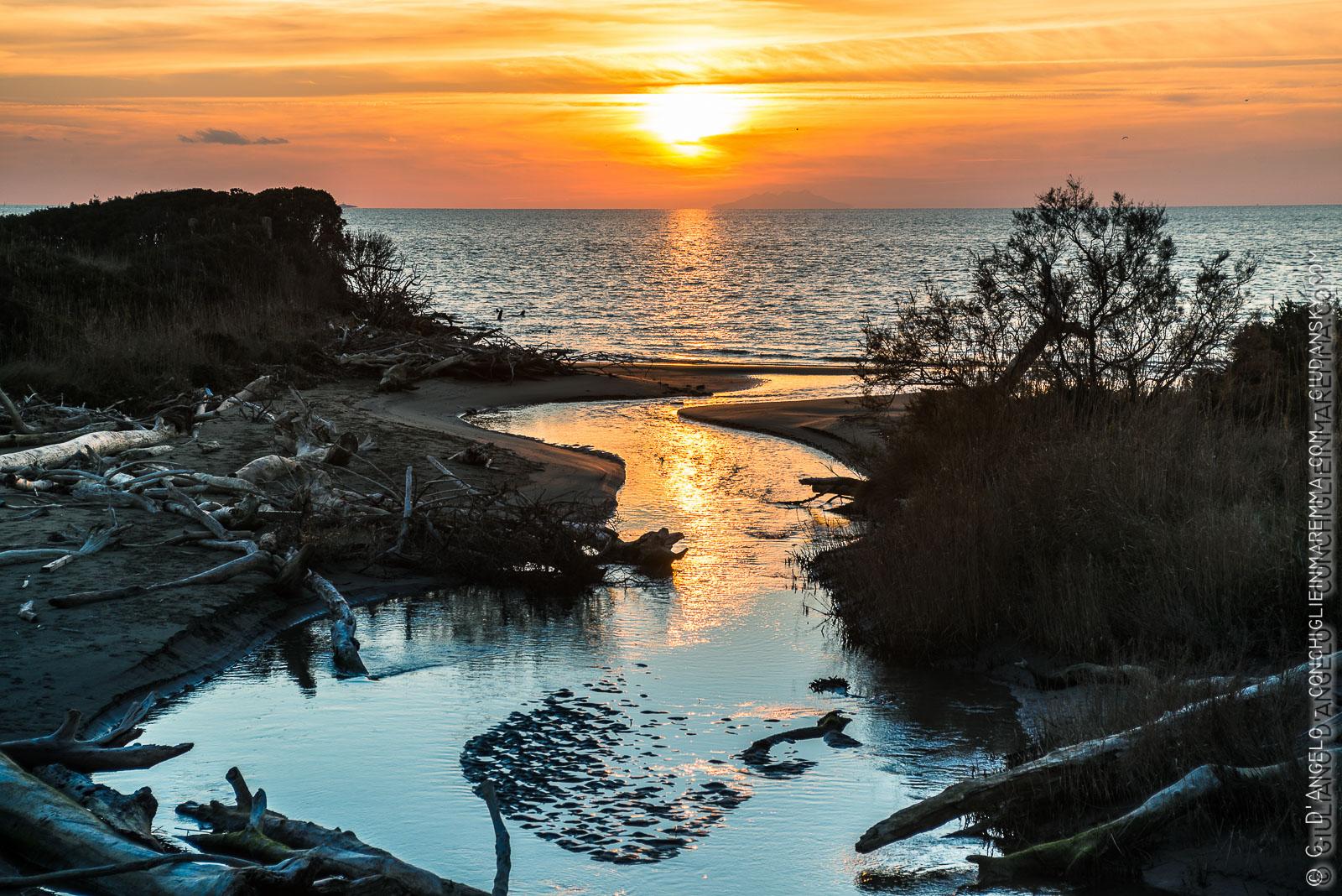d’Ombrone. Qui a quest’ora sembra che il sole non voglia nascondersi dietro l’orizzonte ma proseguire risalendo la corrente. Ed è quello che fa riflettendosi almeno fino alle chiuse delle porte vinciane fin quasi alla torre di bocca d’Ombrone, nel parco della Maremma.
