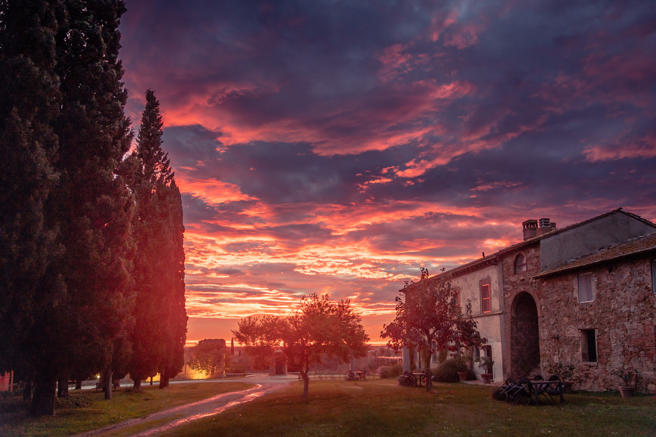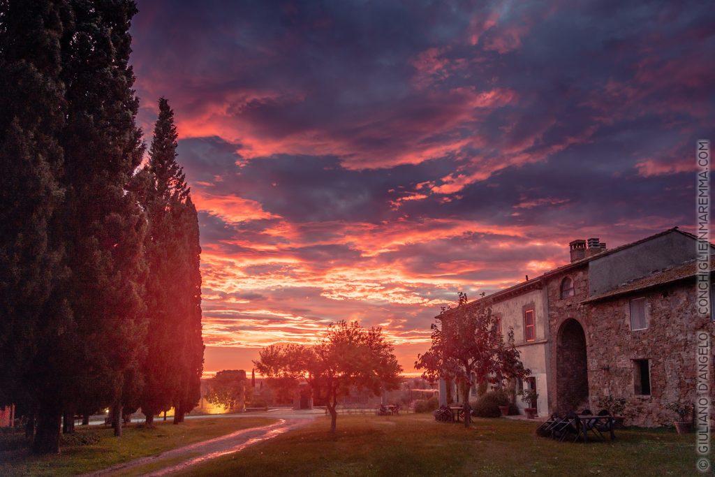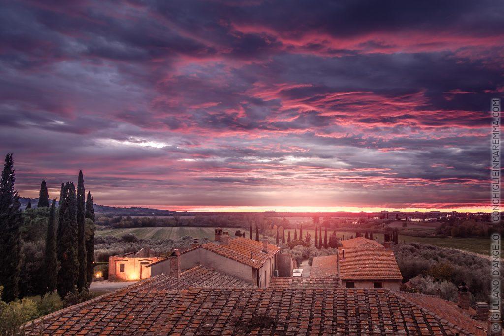 Sono salito di corsa su per le scale del casale antico, ho attraversato il salone dei ricevimenti quasi al buio facendo slalom tra i mobili antichi coperti dalle lenzuola che riflettevano la luce violetta. Ho scattato una foto dalla finestra più alta, sollevandomi sulla Maremma, sempre dietro l’obiettivo, perchè odio le foto con i droni. Pochi istanti dopo la magia della luce era già finita.