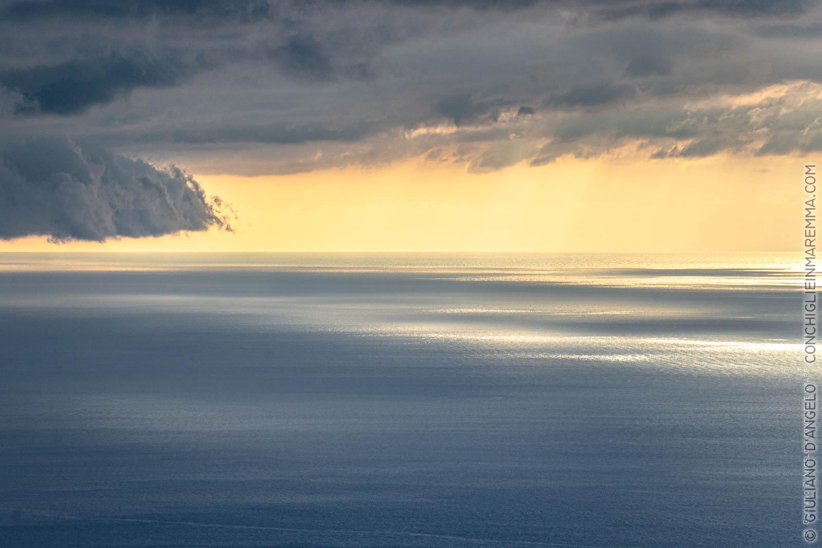 Dalla sommità del monte la luce filtrata dal fronte nuvoloso inquieto; come un’agitata fronda di enormi foglie sopra la terra e il mare.