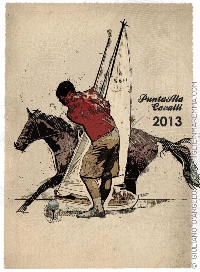 Pubblico questa illustrazione realizzata per celebrare e rappresentare l’evento prossimo organizzato da Punta Ala Cavalli: una giornata di invito allo sport che coinvolge circoli velici, golf e ippica. Come per altri lavori già realizzati, l’immagine vuole anche in questo caso ingannare il tempo: doveva sembrare un reperto tratto da antiche cartoline turistiche tipiche di certi ambienti della “villeggiatura” di un tempo. Grafiche e caratteri tipici di quei ricordi che a volte vengono fuori dalle vecchie guide turistiche; quelle con le foto in bianco e nero e solo le pubblicità a colori, come erano negli anni ’70. Località in voga dal sapore aristocratico e ambienti sofisticati, come in mente mi vengono le terme di Monsummano, i resort e i teatri tenda di Montecatini e certamente, anche Punta Ala.