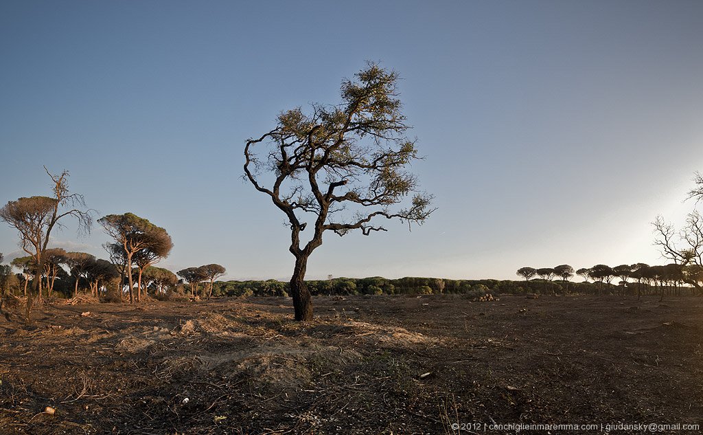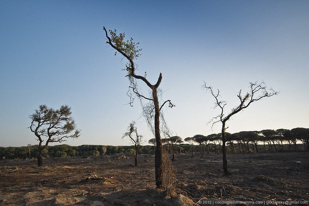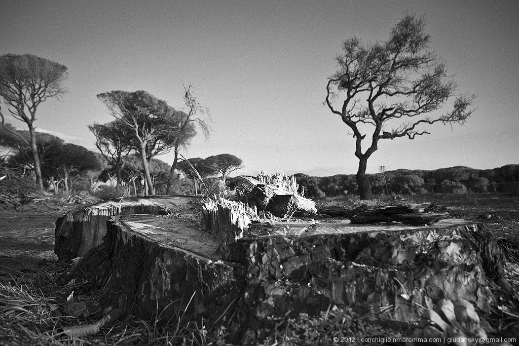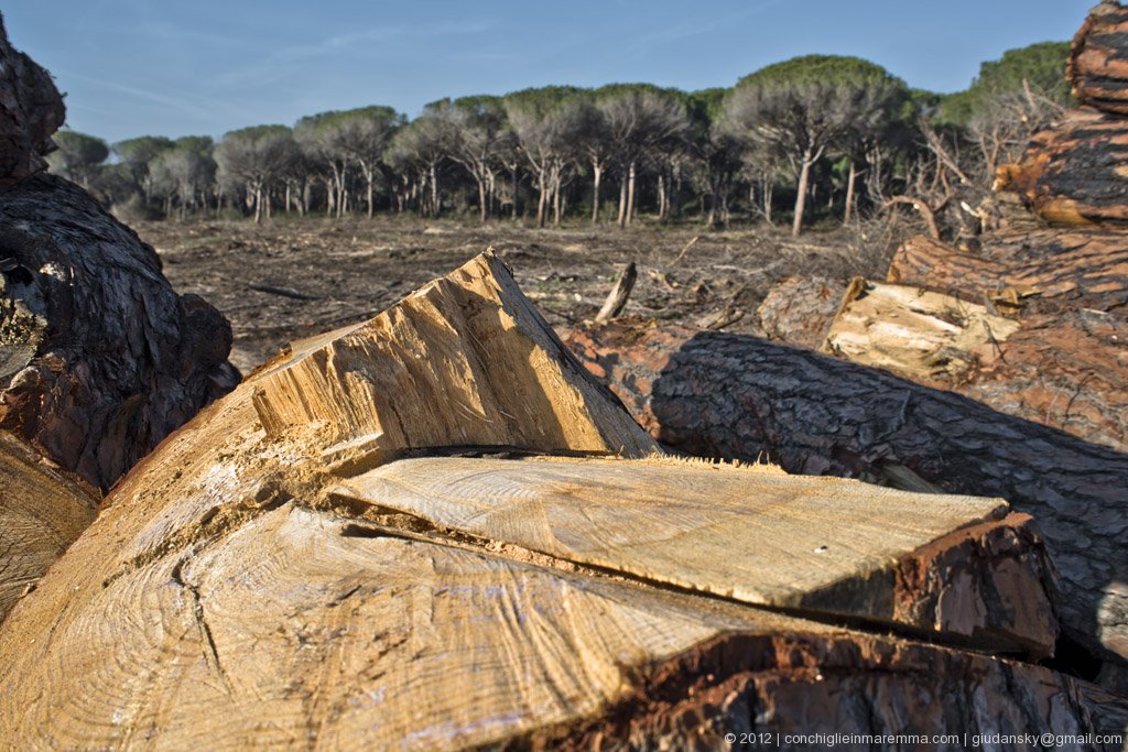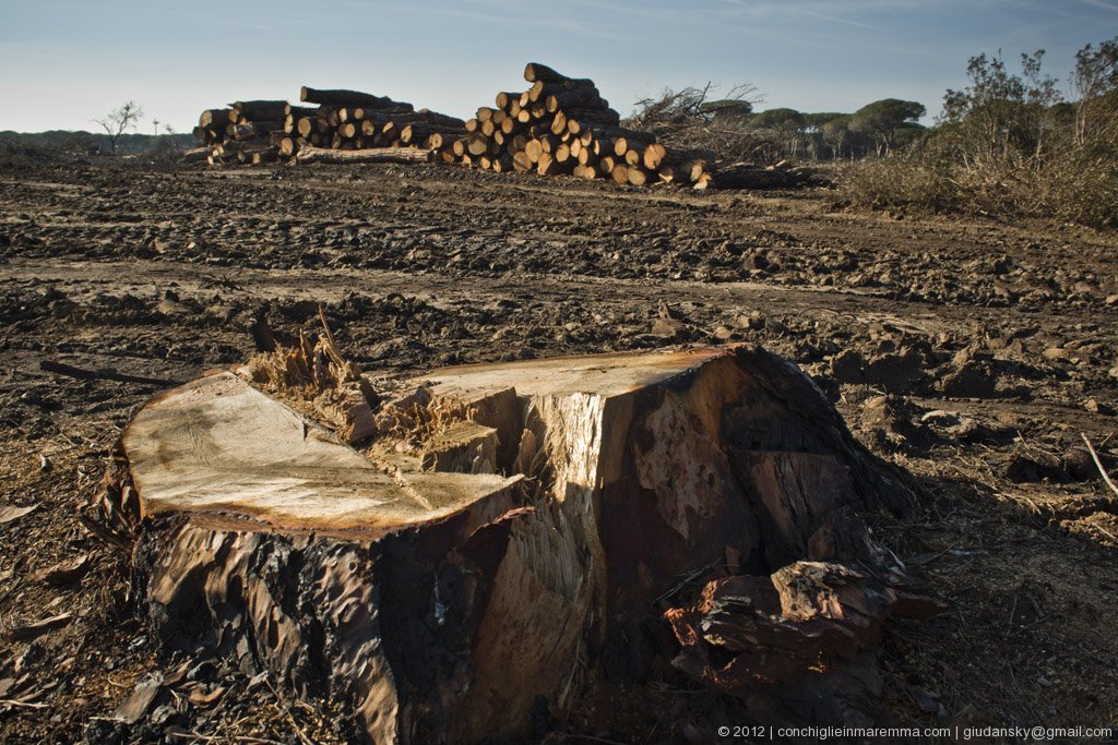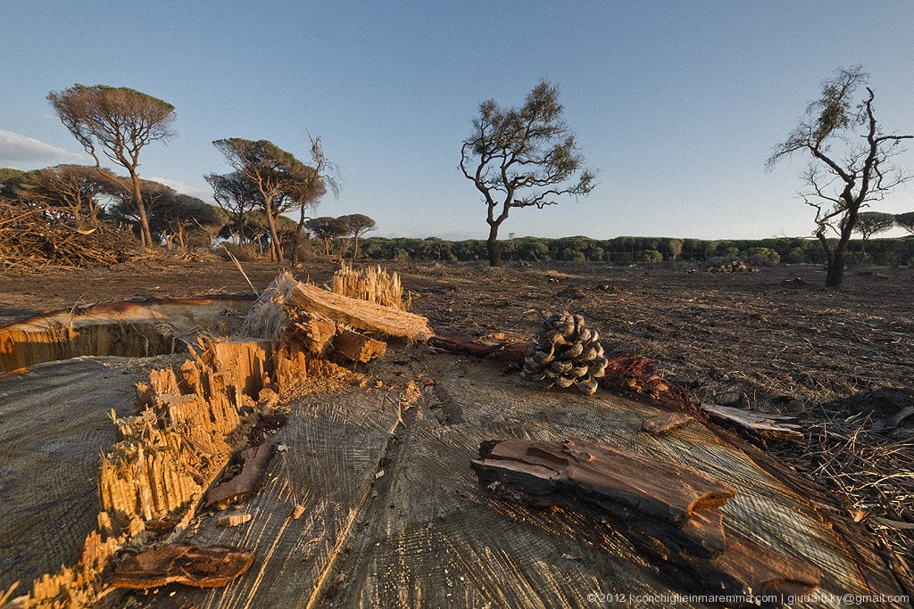 Inizialmente il danno non sembrava così grosso. Nei giorni seguenti all’incendio del 18 Agosto 2012, gli sbuffi di fumo provenivano dal buio fitto della pineta, al di là della strada in un punto imprecisato al centro del bosco che precede Marina di Grosseto. E’ oggi, dopo il disboscamento del cantiere forestale che si scopre davvero quanto il fuoco ha divorato la nostra pineta.