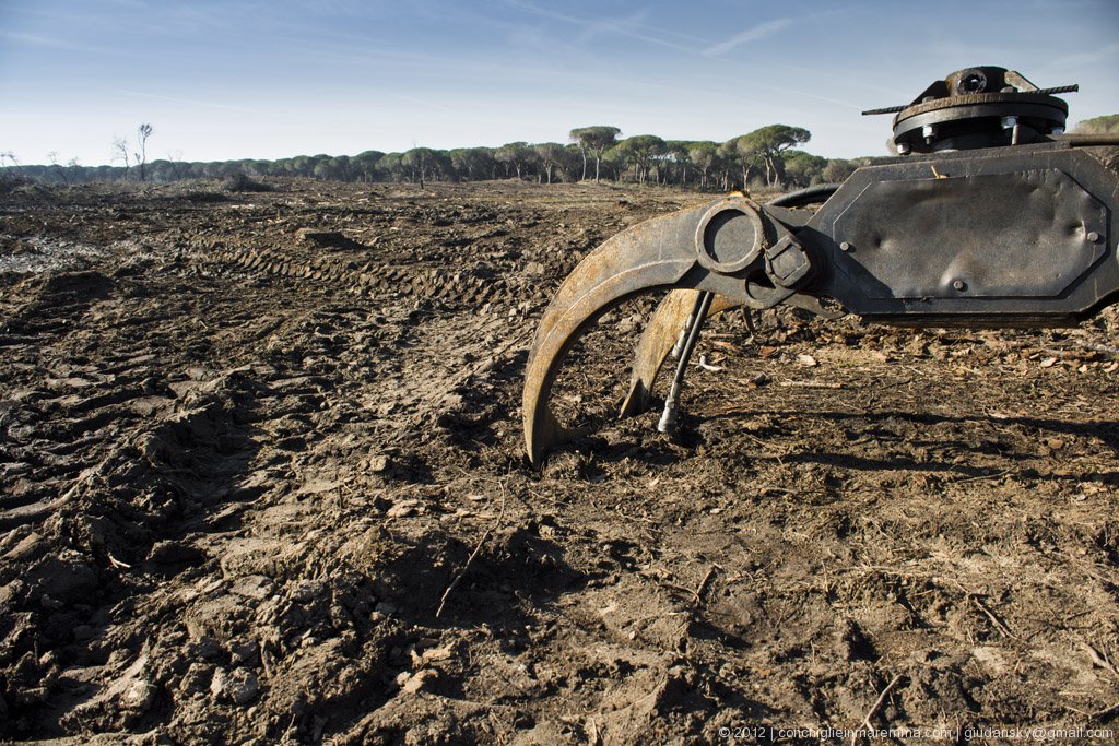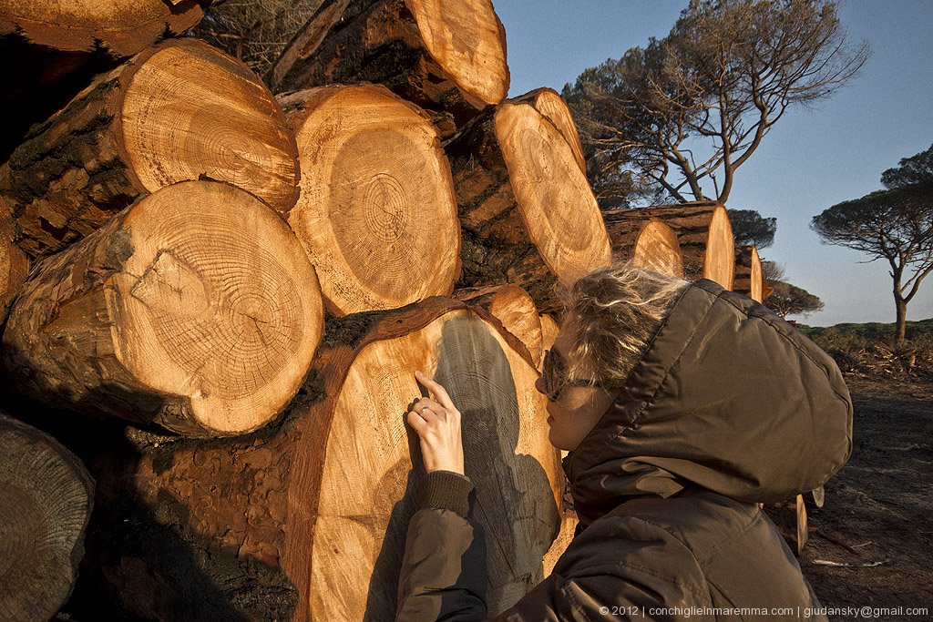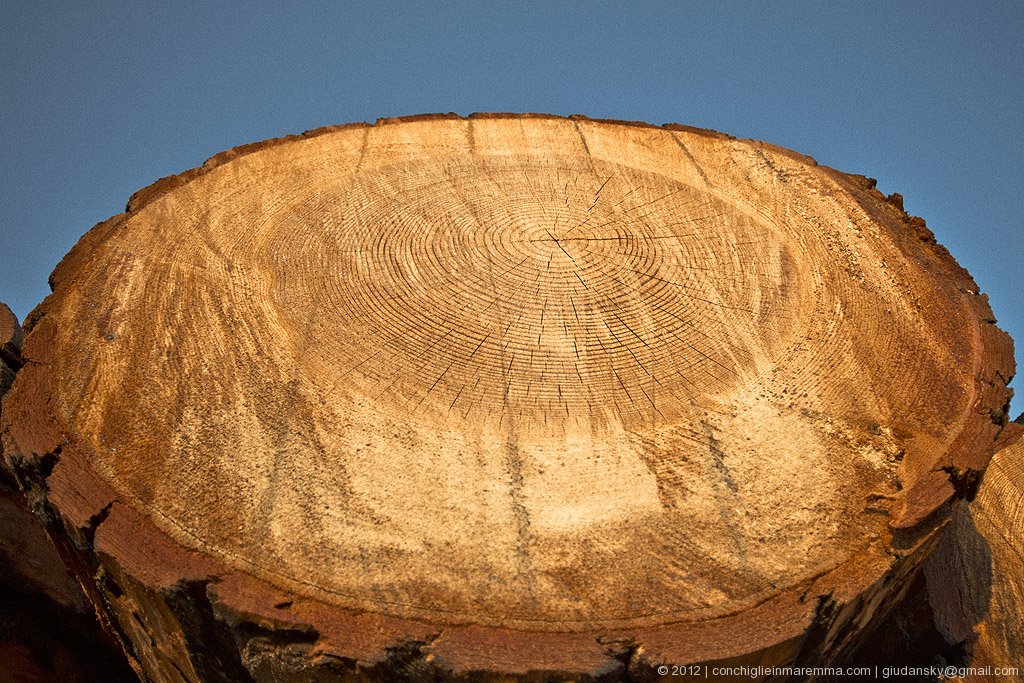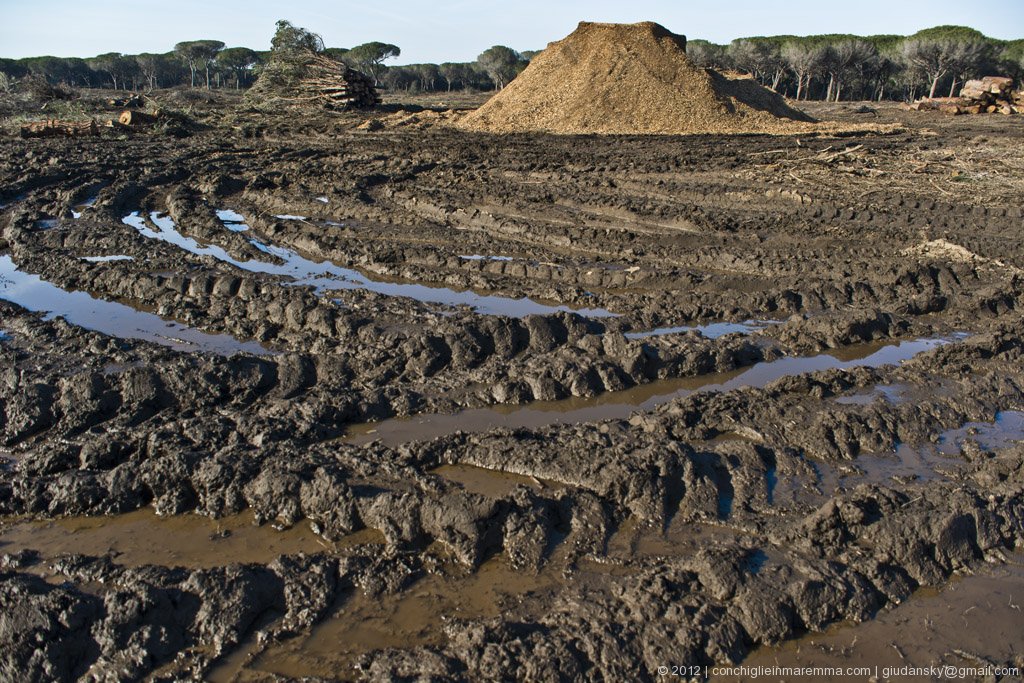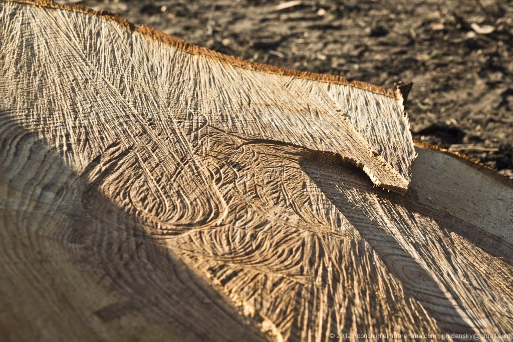 I fusti morti degli alberi abbattuti sono accatastati. Ho contato gli anelli sulla fetta più grande che ho trovato, quasi 1 metro di diametro: 133 anni. I tronchi vengono ridotti in trucioli dalle fauci di una gigantesca trituratrice in grado di inghiottire l’intero fusto in pochi secondi. Quel che resta è una montagna di segatura nel mezzo di una enorme spianata di fango.