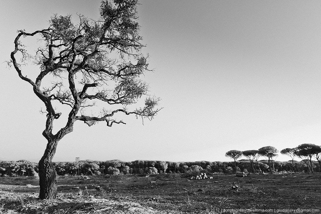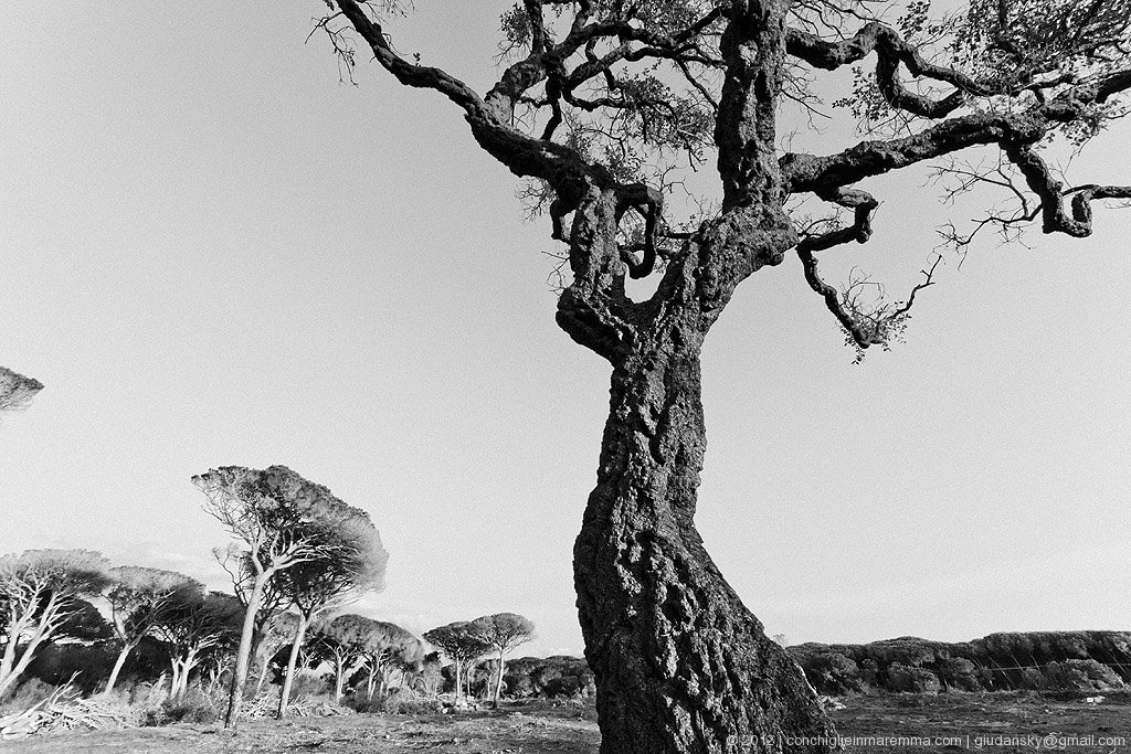 Le querce sembrano le uniche sopravvissute, una di loro sembra ancora spazzata dal vento rovente dell’incendio. Lo spesso strato di sughero nero si sbriciola tra le dita ma sulla sommità dei rami esplodono le nuove gemme; è una primavera anticipata che serve all’albero per riattivare il suo ciclo di fotosintesi.