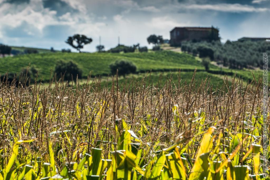 Nuvole in lontananza e sole mattutino di tarda estate sulle foglie verde oro del granturco maturo. Luce meravigliosa, brilla sulle campagne. Il giorno dopo il mare di pannocchie non esiste già più. Scatto pubblicato nella galleria della Maremma Toscana