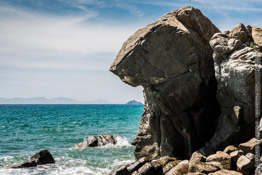 Queste rocce sopra l’isolotto dello Sparviero tra Punta Ala e le Rocchette erano già belle da fotografare. In questa spiaggia raggiungibile solo dal mare, lungo la via delle dogane, in un tardo pomeriggio di trekking. Quando le ho inquadrate cercando di sovrastare l’isolotto e l’isola d’Elba, mi sono reso conto che a quell’ora la luce stava scolpendo questa testa felina. Forse ad altre ore del giorno la testa del puma scompare ma in quel momento riuscivo a vedere i baffi scolpiti nelle scaglie della roccia, le orecchie a punta, il nasone triangolare dell’animale e il suo sguardo verso ovest.