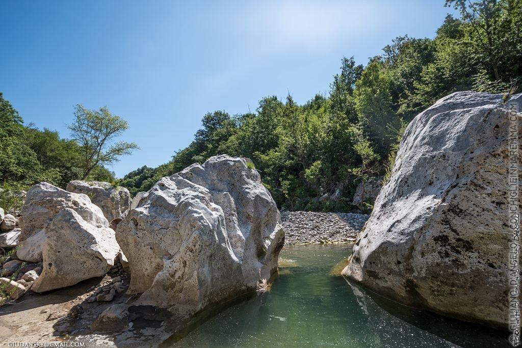 Ecco alcuni scatti, riportati dopo qualche ora di arrampicate, cercando gli scorci migliori e rischiando più volte di far scivolare il peso del corpo macchina dalla spalla alle rocce. Per riprendere il torrente dalle angolazioni migliori ho tentato di raggiungere i sassi più grandi e quelli più sporgenti verso il letto del fiume. Gli scogli di pietra bianca, i travertini e il colore intenso dell’acqua ricordano a tratti quello delle scogliere sul mare della Sardegna.