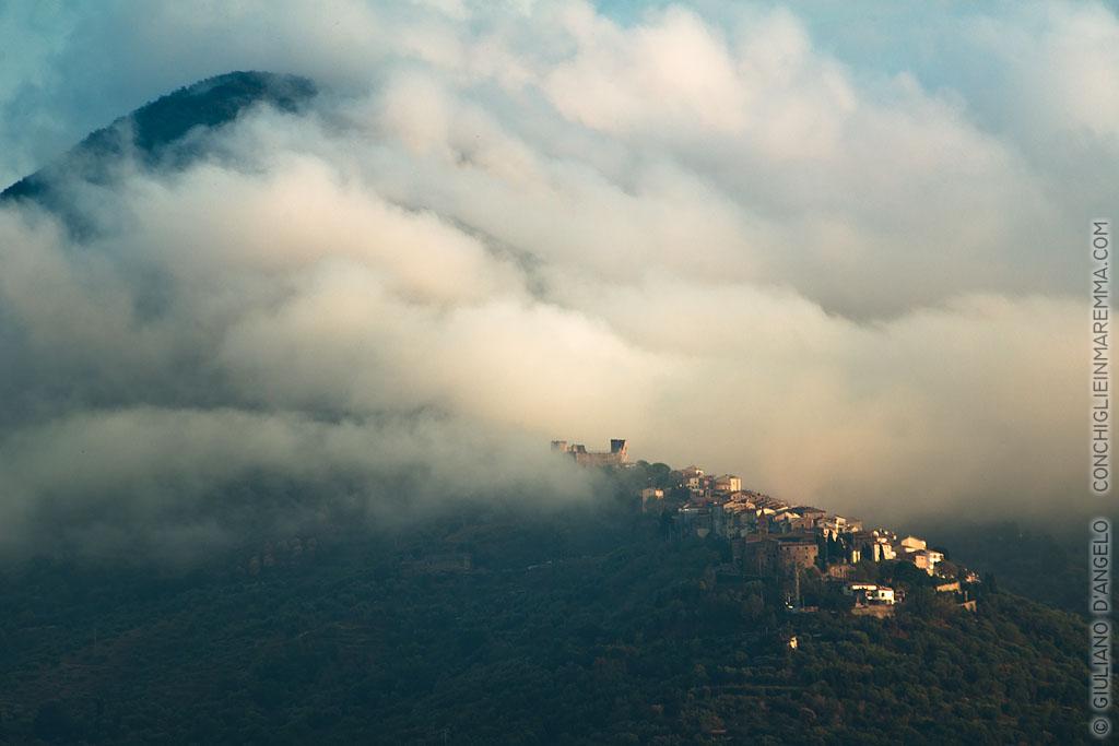 Uno scatto a Scarlino, seconda metà di settembre. Nubi tiepide di scirocco in un pomeriggio piovoso avvolgono il paese come su una alta vetta montuosa. Invece Scarlino è a soli 229 metri di altitudine dall’antico approdo marittimo, il mare è ad un passo da qui. Il suo nome sembra derivi da “Portus Scabris”, cioè approdo su costa frastagliata. Questa costa è quella alta e rocciosa che nasconde le baie di Cala Violina, Cala Martina, Cala Civetta.